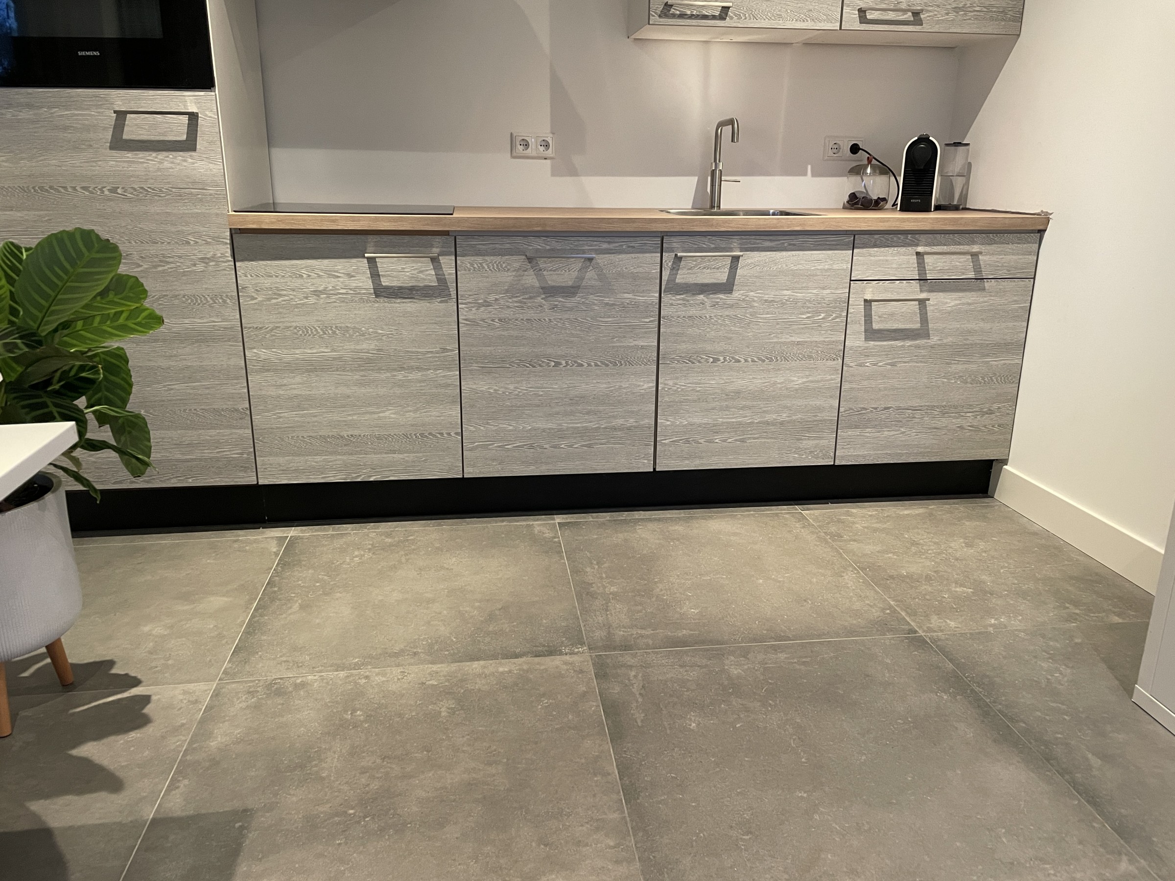 Onlangs benaderde een klant ons met het nieuws dat zij binnenkort hun huidige woning gaan renoveren en gedurende deze periode tijdelijk in hun garage zullen verblijven. Met enthousiasme hebben wij hen bijgestaan in dit proces door niet alleen te voorzien in de legging van een nieuwe tegelvloer in de keuken, de hal, douche en het toilet maar ook door een volledig functionerende sanitaire ruimte te creëren. Deze klanten hebben gekozen voor een tijdloze betonlook tegels voor in hun keuken. Voor de gang, het toilet en douche is er gecombineerd in tegels. Zoals je kunt zien een houtlook gecombineerd met een betonlook tegel.